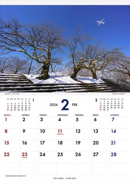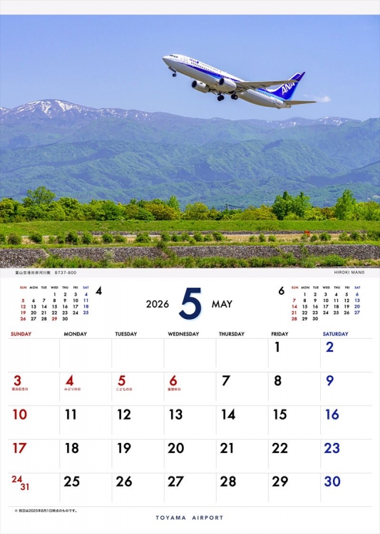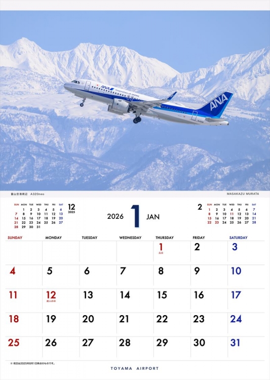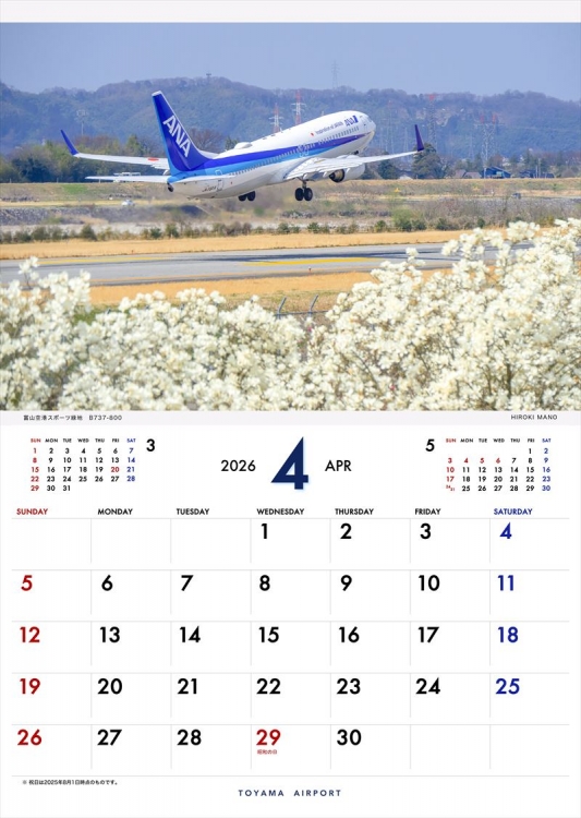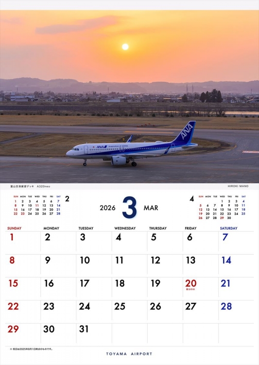 2020年より定番となった「富山空港フライトカレンダー」の2026年版の登場です。富山空港周辺で撮影した情景的ヒコーキ写真で構成しました。富山に行ってみたい!富山でヒコーキを撮影してみたい!と思っていただけると嬉しいです。カレンダーを通じて富山の四季をお楽しみ下さい。