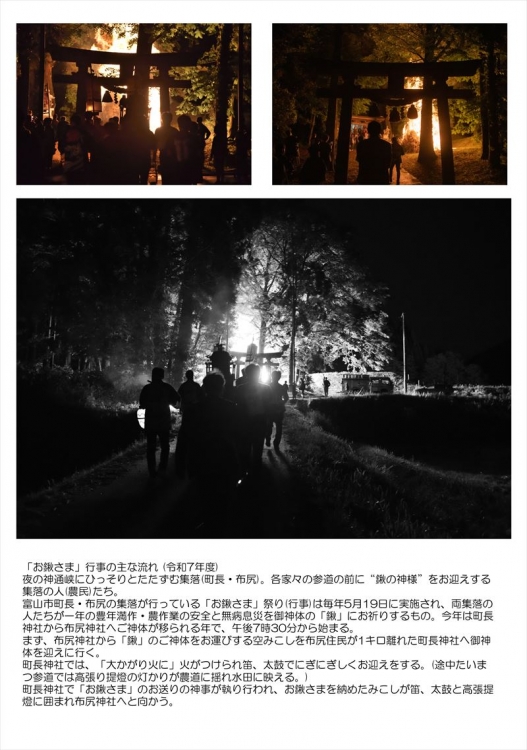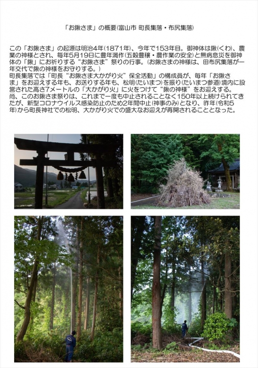 夜の神通峡にひっそりとたたずむ町長・布尻両集落が行っている「お鍬さま」祭り(行事)。毎年5月19日に実施され、両集落の人たちが一年の豊年満作・農作業の安全と無病息災を御神体の「鍬」にお祈りする。