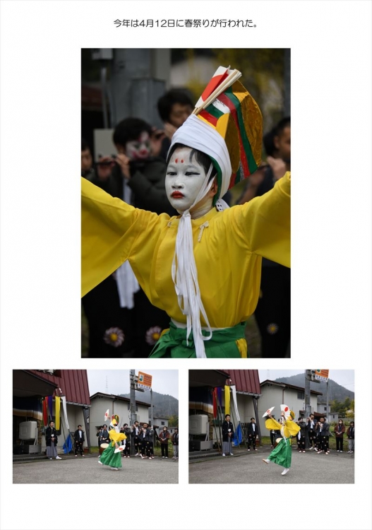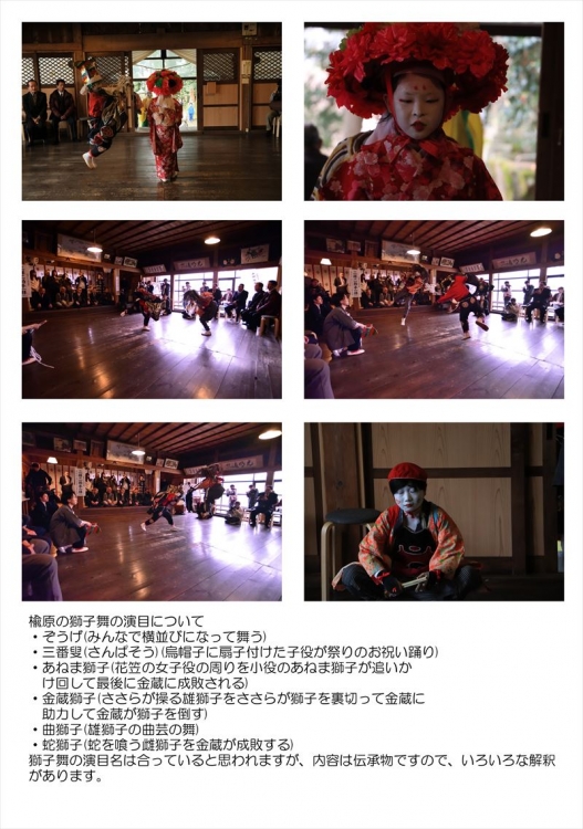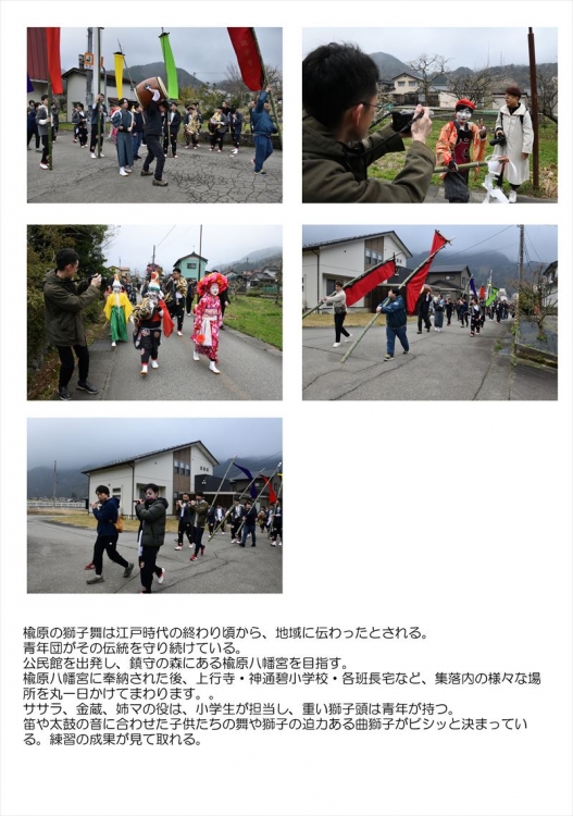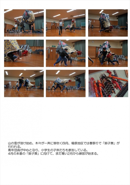 神通峡地域では、毎年春と秋に祭礼が行われ、春季祭礼(春祭り)では獅子舞が奉納されています。現在獅子舞が行われているのは、岩稲・楡原・庵谷・猪谷・町長の5地区です。飛騨地方から伝わったとされる二人立の「金蔵獅子」が中心で、内容はそれぞれの地区で少しずつ違っています。この写真集は、楡原地区の獅子舞の記録です。
